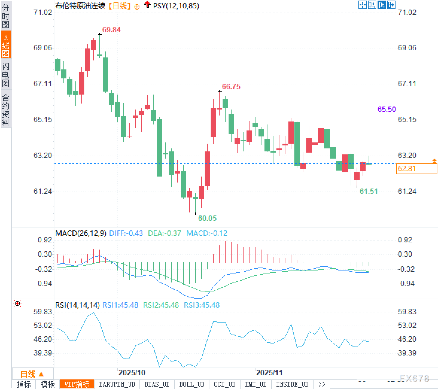 汇通财经APP讯——11月28日,星期五。当前国际原油市场正处于多重因素交织的复杂格局之中,布伦特原油价格欧洲时段于每桶62.80美元附近震荡运行。近期市场主线围绕供给端政策动向、地缘局势演变以及全球需求前景展开博弈,整体走势延续疲弱,已接近两年多以来最长的月度连跌周期。