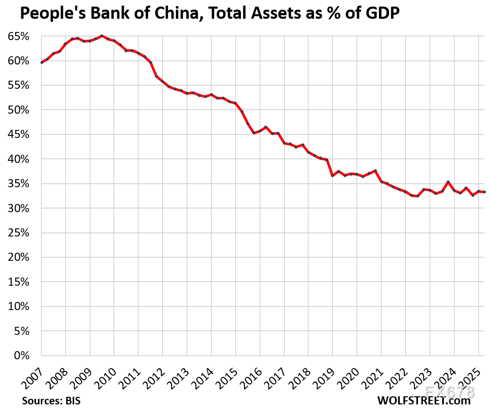 尽管该数值已完全消化疫情期间的QE峰值,较2021年第四季度68%的印钞峰值大幅回落,但仍处于历史高位。(对比来看,美联储资产/GDP比例在2022年初触及36%的峰值,目前已降至21.6%。)