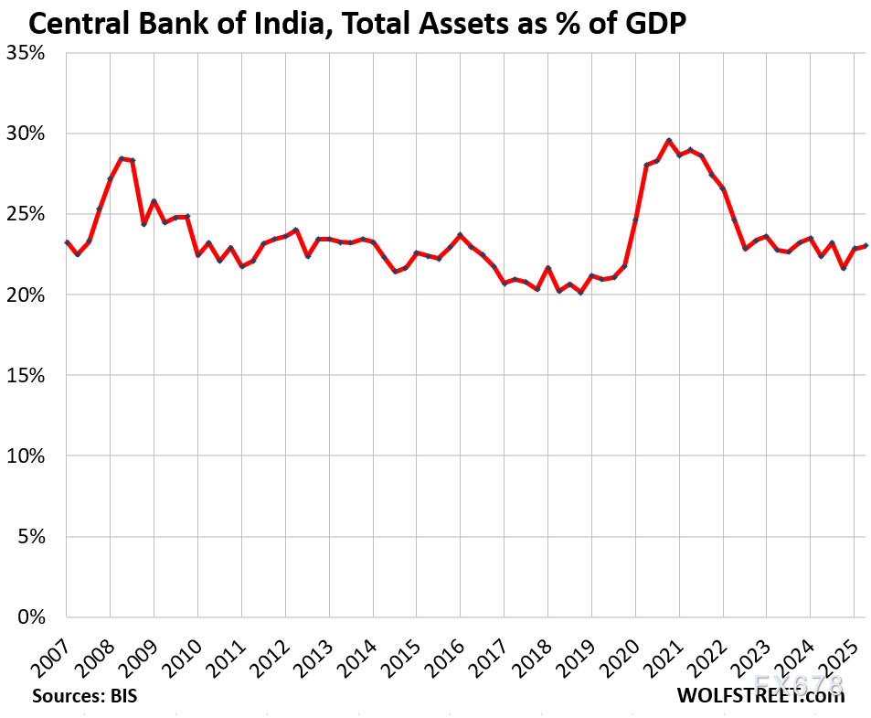 印度储备银行需持续应对本币(兑美元)贬值压力,曾在两次危机期间短暂实施QE,但很快回归至23%的常规资产/GDP比例(上一季度数据)。