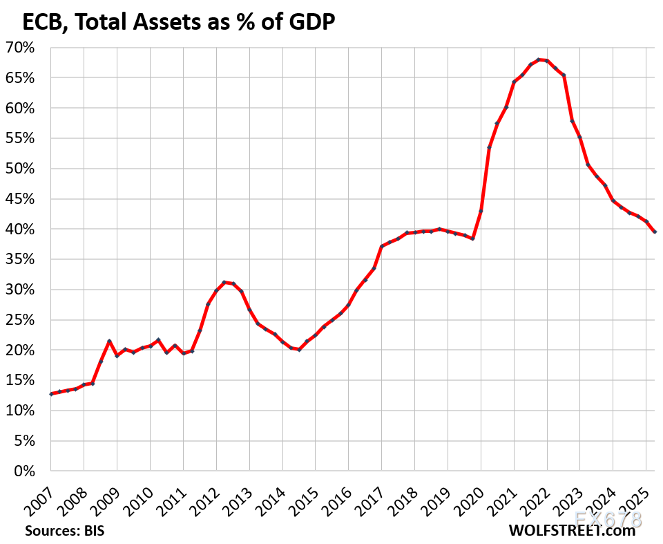 据国际清算银行今日数据,欧洲央行总资产/GDP比例已降至39.5%。