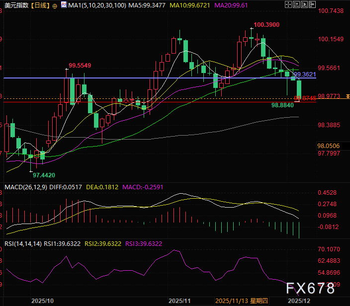 汇通财经APP讯——周三(12月3日)亚欧时段时段,美元指数全天单边下跌,终于尾盘配合低于预期的ADP数据,加速赶底最终调整一步到位。目前交投于98.93(-0.38%),盘中最低跌至98.88。