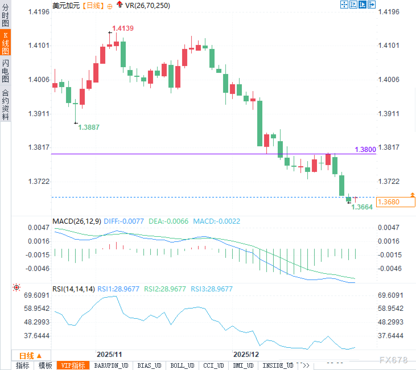 美元兑加元的价格结构已经把“再定价”写在图形里。日线层面,汇价自前期高位回落后,1.3800附近的关键水平由支撑转为压力,市场记忆在该区域较为清晰;当前1.3680处于更低的波动区间,近期低点在1.3664附近,显示空头趋势仍占主导。动量指标方面,RSI处于约29的偏低位置,意味着短线情绪偏弱、卖压释放较充分;MACD位于零轴下方,反映下行趋势尚未出现明确的趋势扭转信号。需要强调的是,指标偏低并不自动等同于趋势结束,它更多揭示的是“波动的阶段性极端”与“情绪的单边化”,后续若出现基本面或利率预期的反向催化,更容易触发以回补与修正为主的价格波动。